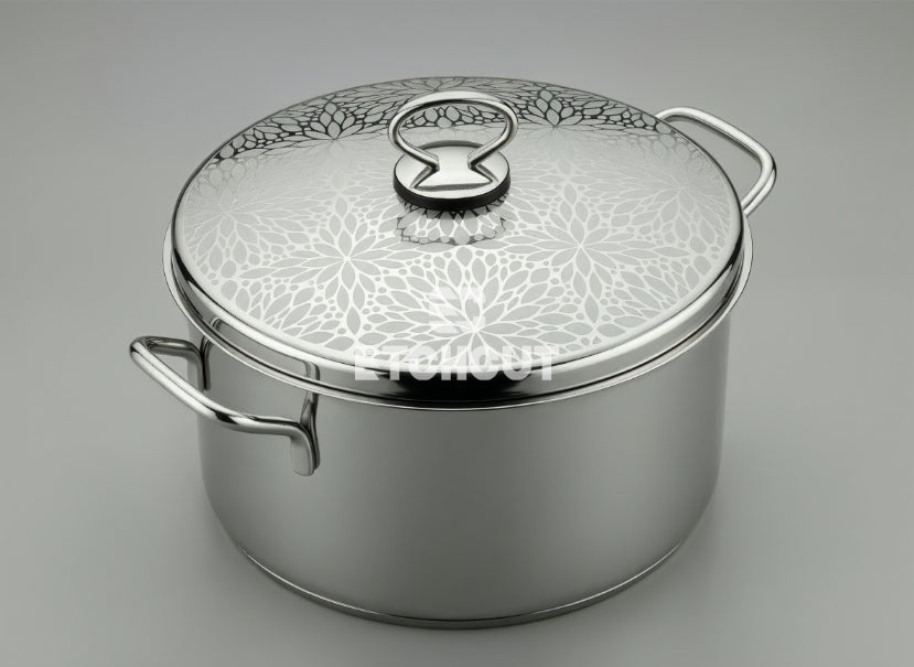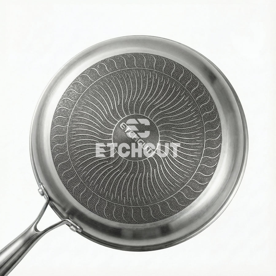 Honeycomb triply cookware is manufactured by chemically etching a precise surface pattern and filling coating within the etched cavities. Because the coating sits below the steel surface, it stays protected from spatulas and metal tools—making the cookware more durable and long lasting.Chemical etching is the only process capable of creating this controlled surface texturing uniformly across large cookware surfaces. Etchcut’s nanotechnology-based systems ensure consistent honeycomb formation, critical for performance and quality.
